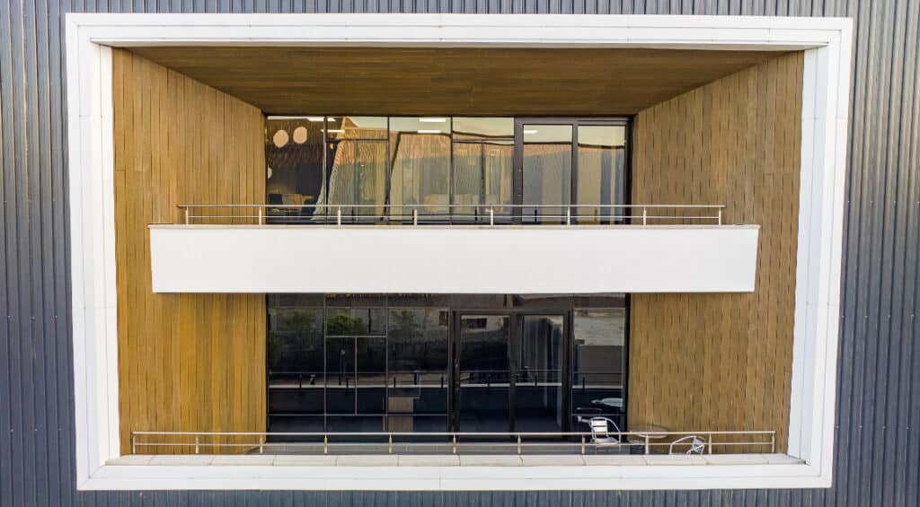 water-resistant cladding, VistaClad, in Oasis Palm colour, was mounted inside each frame, providing the desired earthy, organic feel to create a warm, welcoming cocoon for all to enjoy. The authentic looking wooden shade and patterned texture, made
